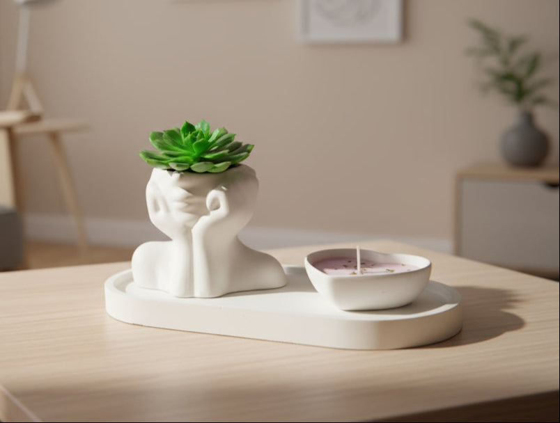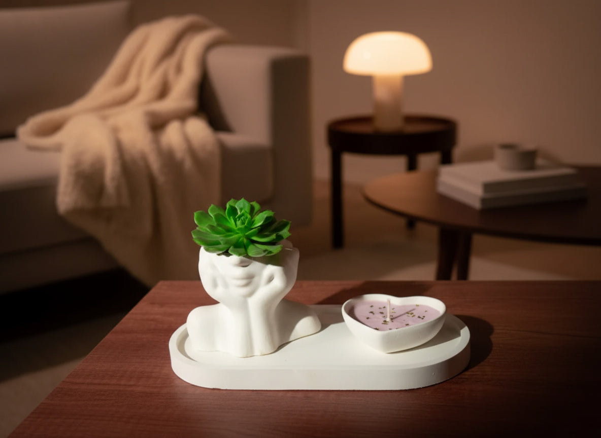 Sorprende y enamora con nuestro exclusivo "Kit: Amor y Amistad (para mujer)", un regalo que combina elegancia y calidez en cada detalle. 🌸 Este set incluye una delicada pieza en concreto con forma femenina, acompañada de una hermosa suculenta que simboliza la fortaleza y el crecimiento continuo. 🌿 Todo dispuesto sobre una bandeja decorativa que añade un toque de sofisticación, y completado con una vela en forma de corazón, aromatizada con aceites esenciales que llenarán el ambiente de una fragancia suave y envolvente. 🕯️